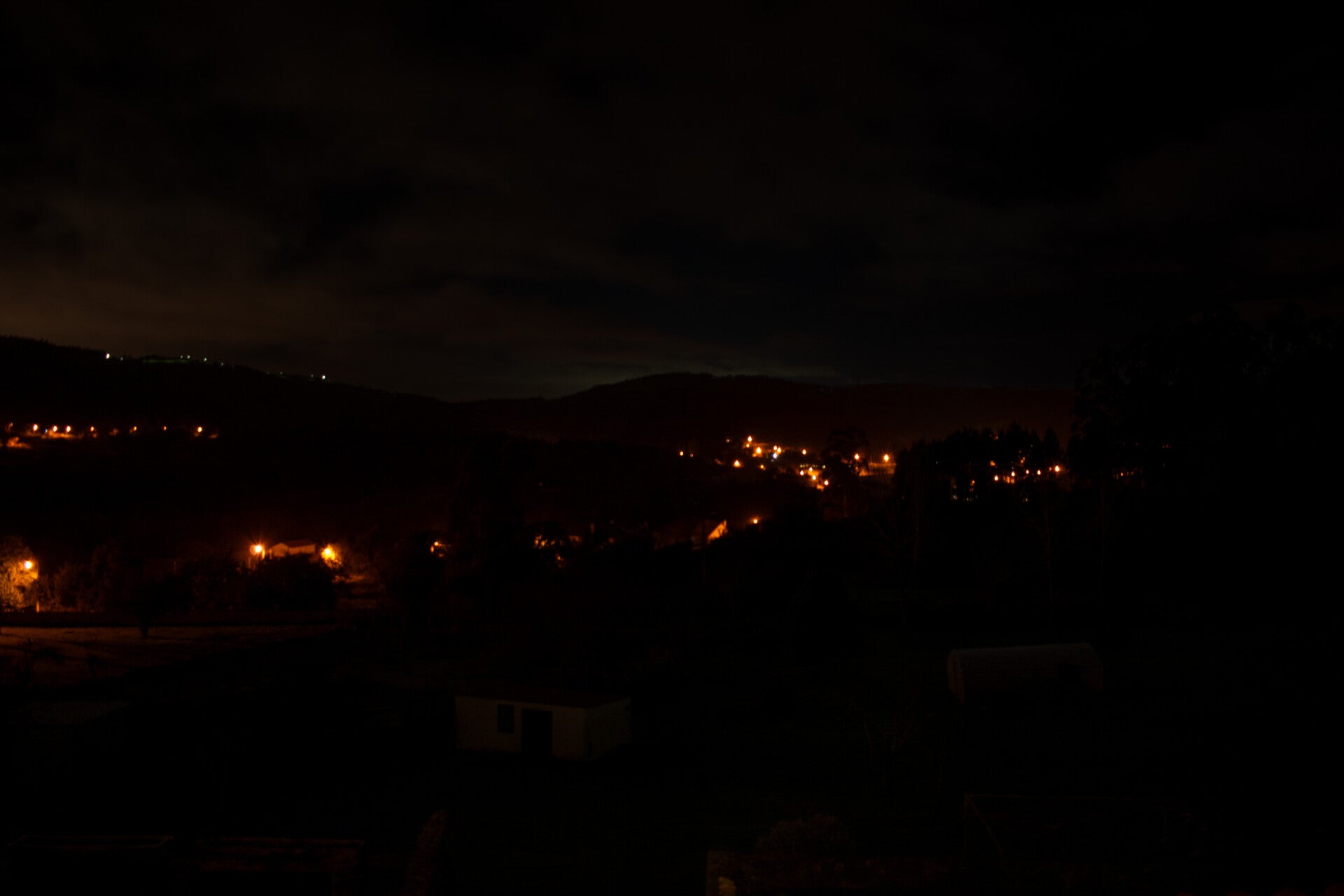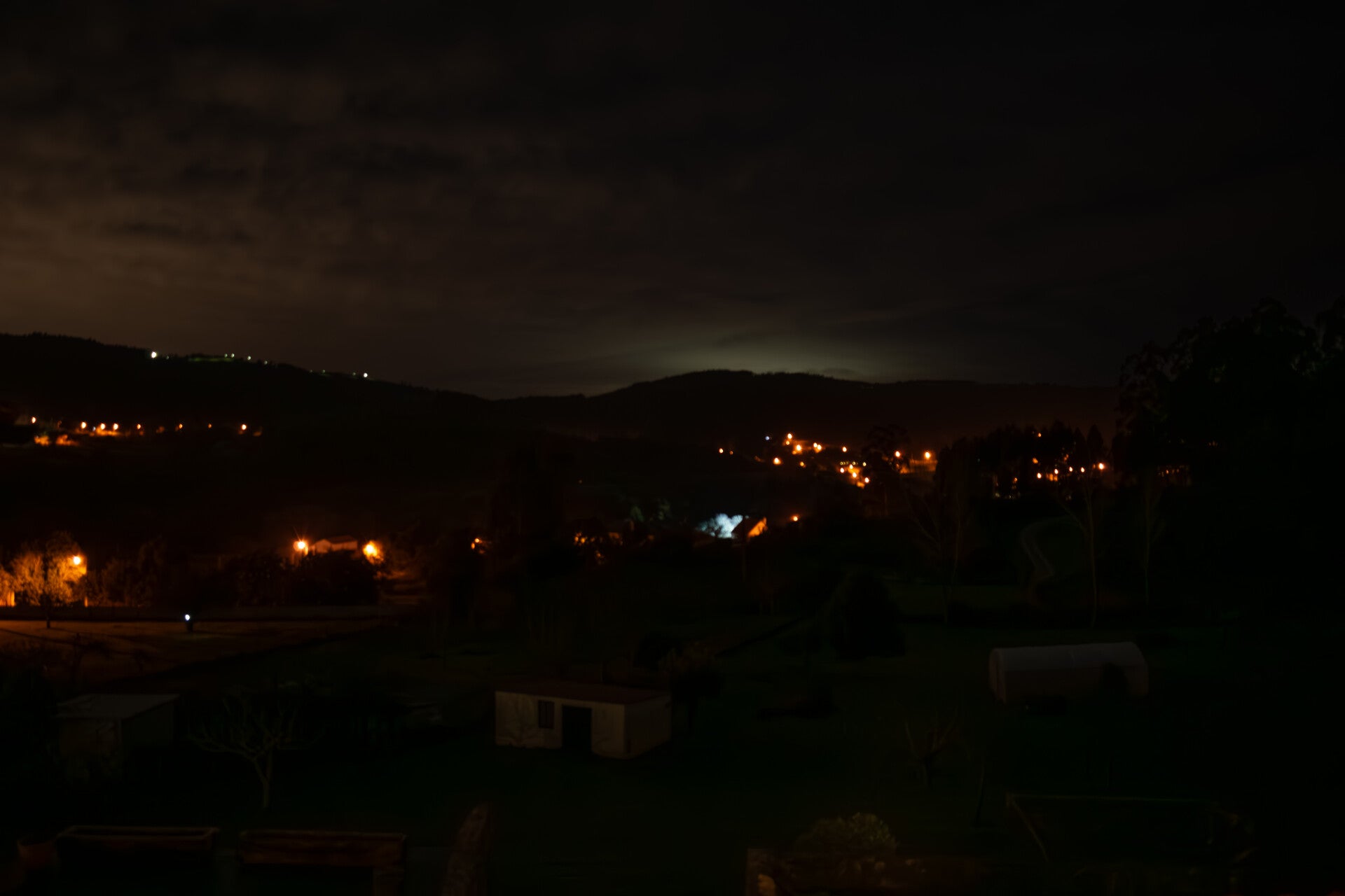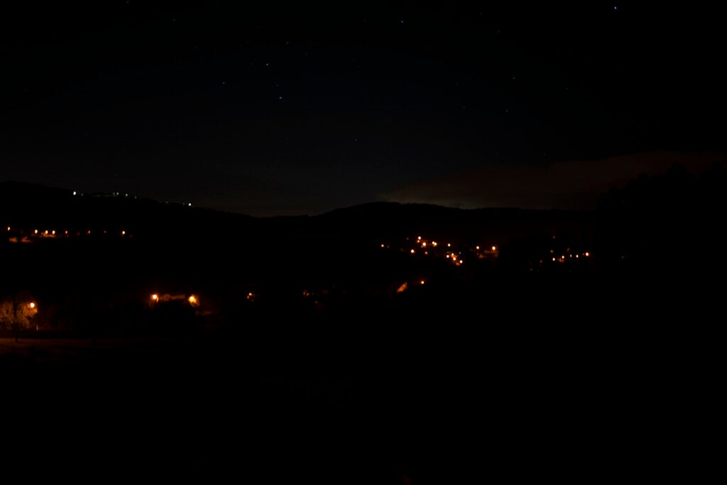 Prácticamente ya no se distinguen los objetos solo se ve el relieve de la montaña y las luces naranjas.