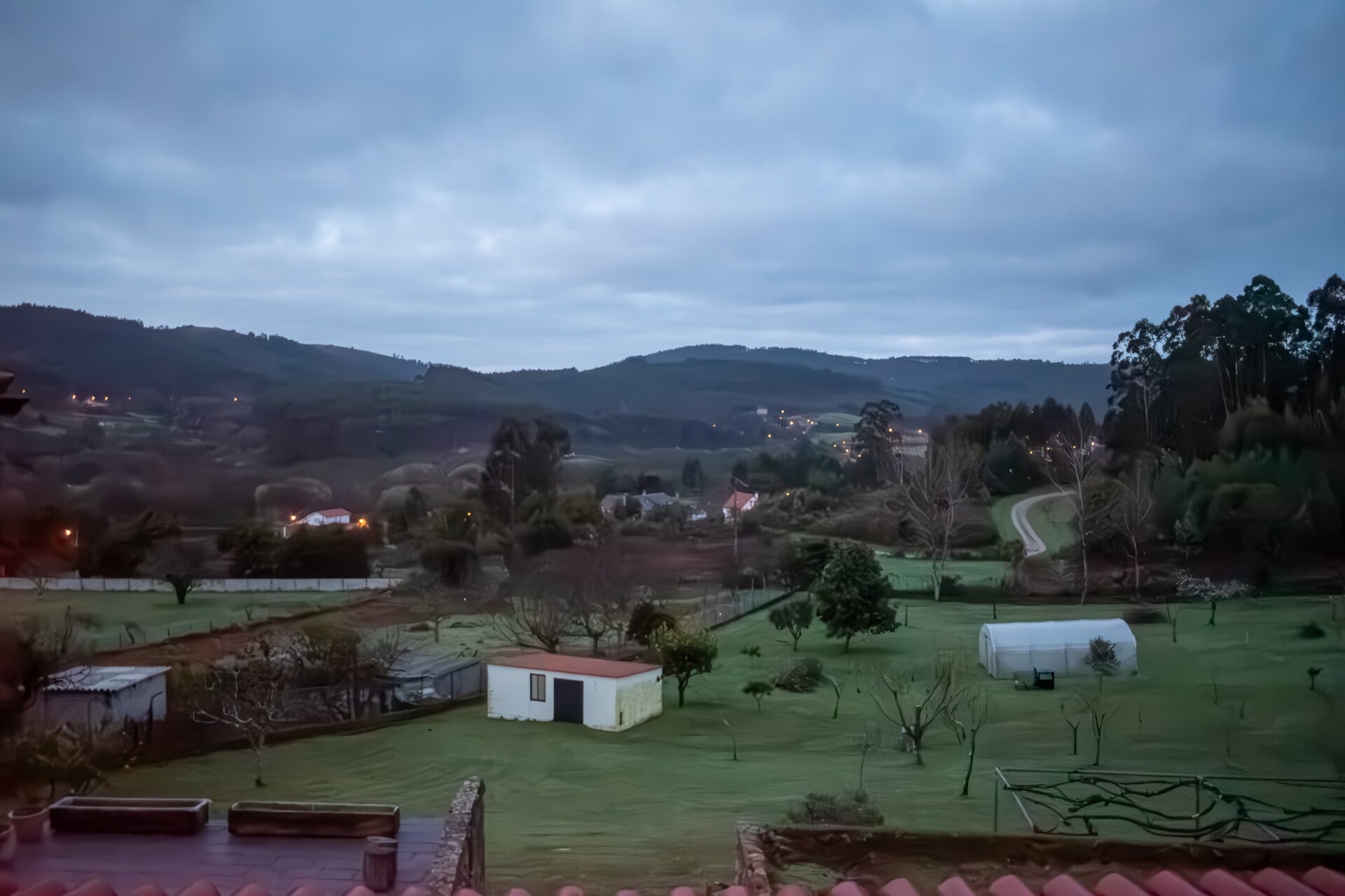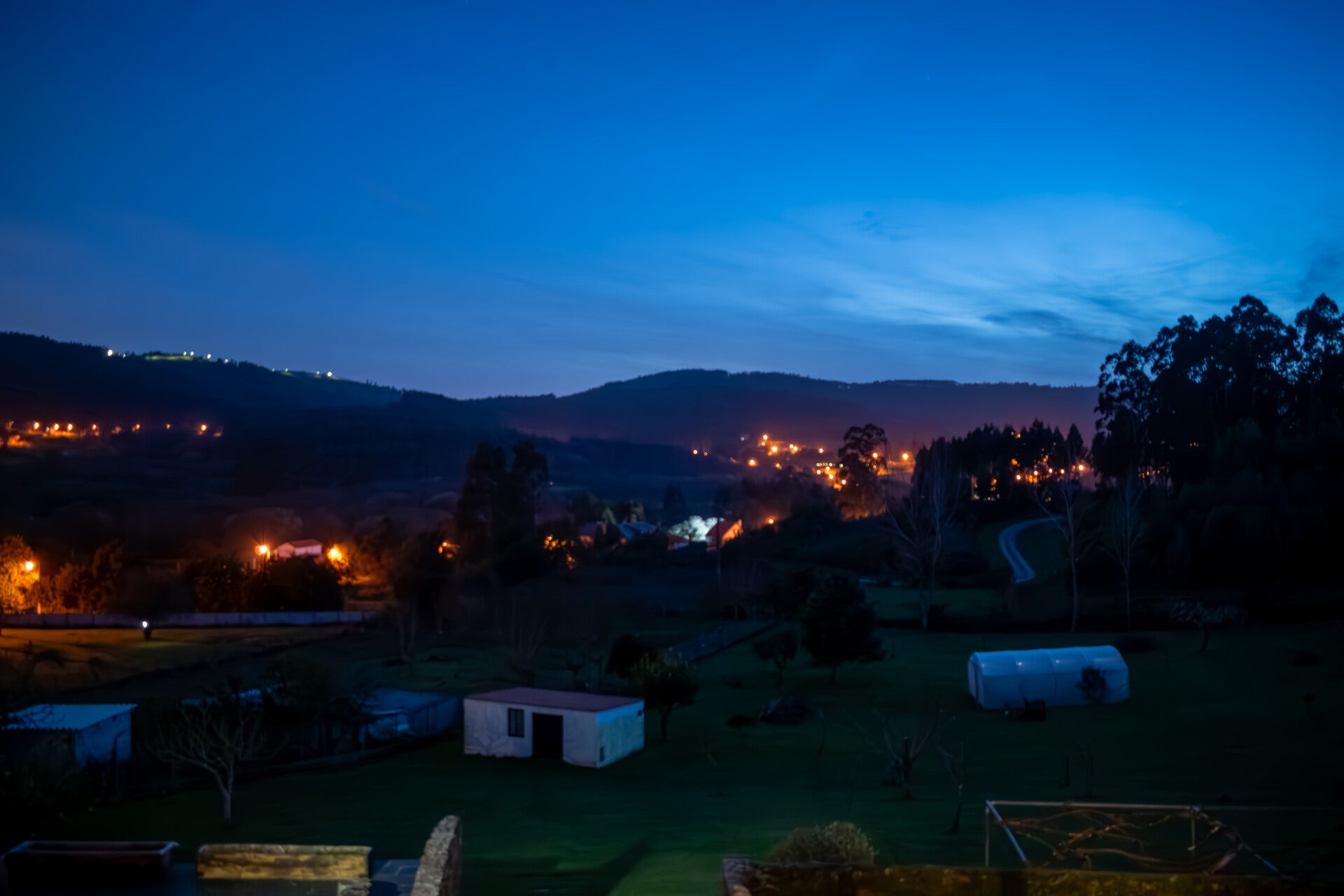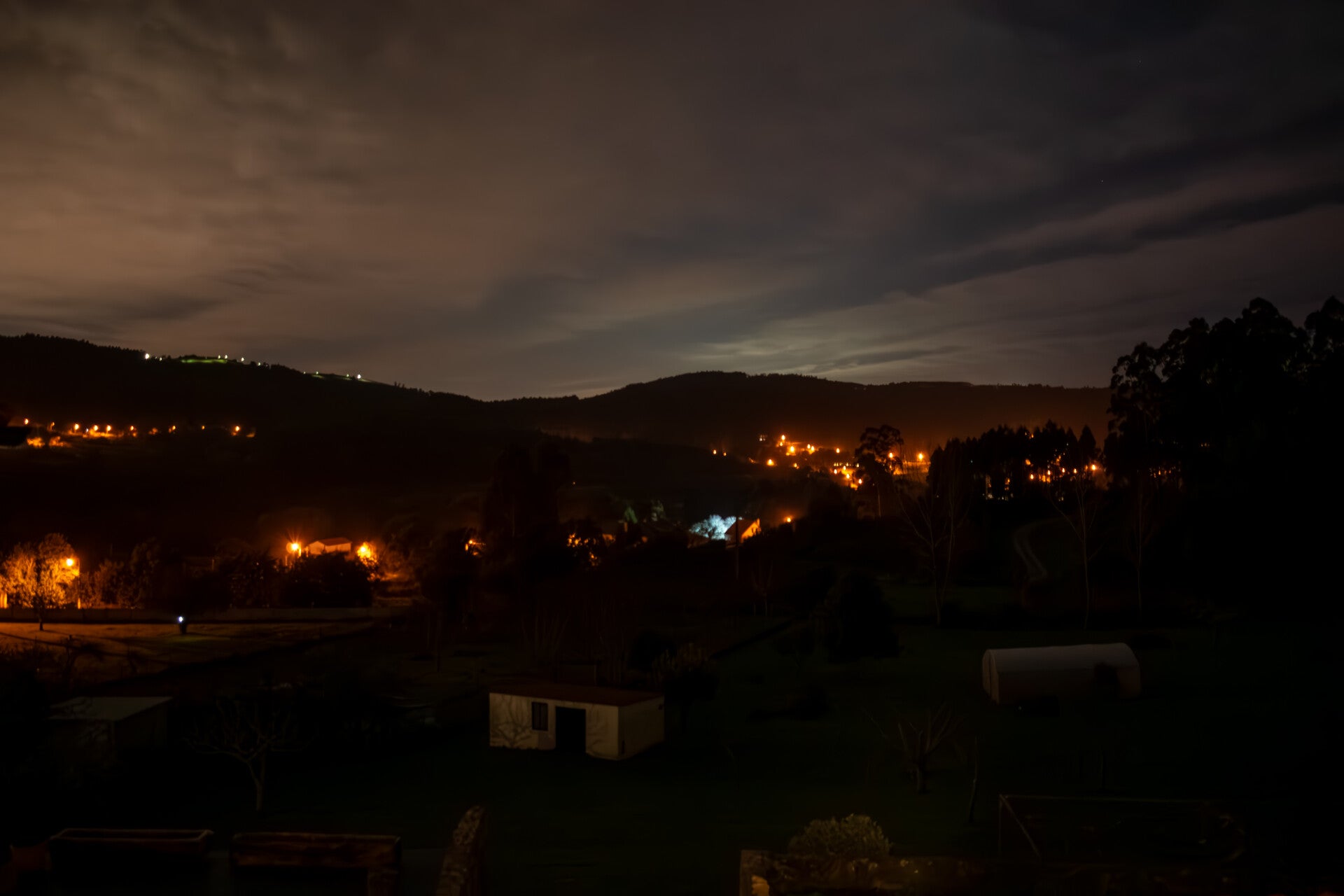 Prácticamente ya no se distinguen los objetos solo se ve el relieve de la montaña y las luces naranjas.
